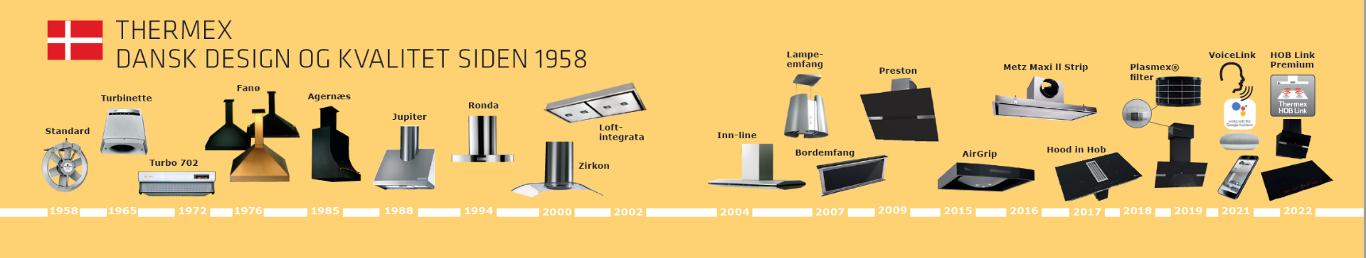 Det skulle vise seg at denne løsningen senere skulle vinne innpass rundt om i verden, og brukes i dag i et stort antall i kjøkkener. Som det fremgår av historien er THERMEX ikke bare kjøkkenviftens mor, siden starten i 1958 har THERMEX kontinuerlig utviklet og markedstilpasset produktene til tidens trend og etterspørsel.