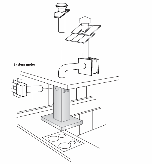 Motoren plasseres vekk fra hetten, f.eks. på loft, tak eller yttervegg. Det gir større utsugskapasitet og gir mindre støy.