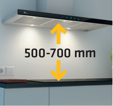 THERMEX anbefaler at du monterer kjøkkenhetteni en høyde på 500-700 mm over komfyren. Vær imidlertid alltid oppmerksom på gjeldende lovkrav og spesifikasjoner for komfyrer, platetopper og ventilatorer.